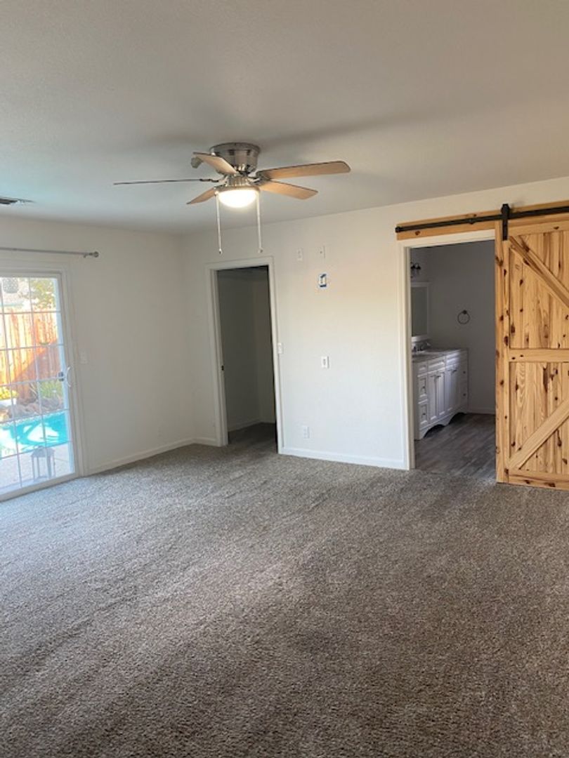 Check out this beautiful home, a gem that boasts 3 spacious bedrooms and 2.5 bathrooms with over 2,000 sq. ft. The split floor plan ensures privacy, with a master suite that includes a private bathroom and a tiled shower. The home is adorned with carpet, laminate flooring, and granite countertops that add a touch of elegance. The kitchen is a chef's dream with a double oven, gas cooktop, and a cozy nook for casual dining. The property also features a whole house fan and ceiling fans throughout, ensuring comfort in every season. Step outside to a beautifully landscaped yard, complete with an inground pool, an outdoor kitchen, and an outside shower/changing area. The yard also houses a gazebo and three storage sheds, providing ample space for storage and outdoor entertainment. The property is equipped with a newer solar system, ensuring energy efficiency. Parking is a breeze with two driveways, a garage, a covered carport, and an extra area for R.V. parking. The home is enclosed by an extra high privacy fence, offering a private oasis in the heart of the city. Yard & Pool Service provided.